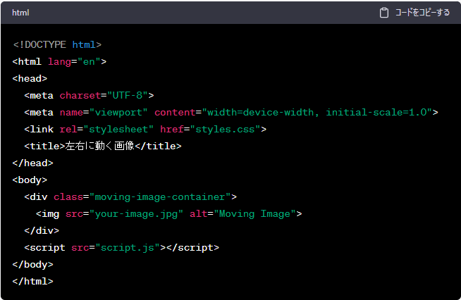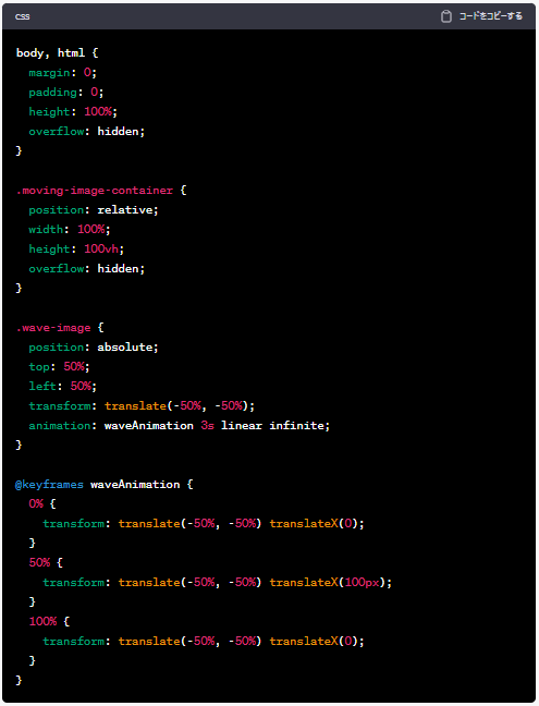 ChatGPTによるプログラミングで動くアニメーション実装 2023年8月10日 最終更新日時 : 2023年8月10日 akaruka プログラミングで稼ぐ(ChatGPTでコードを教えてもらう) 波のように動く画像 今回は↑↑↑のアニメーションを作ってみますプログラミングやWEBページ制作、動画編集などでフリーランスの方がクラウドワークスやランサーズといったサイトで仕事を請け負う働き方も今ではあたりまえになています。プログラミングの制作のサポートにChatGPTはかなり有用です。この記事にアニメーションを実装してみましたので、どのようにしてみたのか簡単に説明していきます。今回は”サイトアイコンの「ぬ」を左右に動かしてみます^^まず、チャットGPTにWEBサイトのトップページで画像が左右に動くプログラミングコードを教えてください。動き幅は100ピクセルで波のように動いてくださいとプロンプトを記載しました。結果は”指定された要件に基づいて、画像がトップページ上で左右に100ピクセル幅で波のように動くアニメーションを実装するコードを以下に示します。このコードはHTML、CSS、およびJavaScriptを組み合わせています。まず、HTMLファイルを作成します(例:index.html)” ”次に、CSSファイルを作成します(例:styles.css)。” 上記の二つのコードが生成されました。(今回JavaScriptは生成されませんでした)簡単に説明しますと、最初のindex.htmlファイルはホームページの内容を示しているものです。次のstyles.cssファイルはサイトのスタイルなど見た目等を記述したものになります。2つの生成されたコードをそのままコピーしWindowsメモ帳に貼り付けそれぞでindex.html とstyles.cssのファイルとして保存してみます。(※同じフォルダに入れてください)index.htmlファイルを実行してみますと以下のようにブラウザが起動され真ん中で「Moving Image」が左右に動いています。 波のように動く画像 どうですか?プログラミングの知識はなくても、ChatGPTに聞いてみればコードが生成され、動くアニメーションができました。 この記事にもそのまま実装しました。 生成されたコードからの修正点は、「ぬ」の画像の指定と高さをheight:100vhを70pxに変更し、スクロールの不具合を修正しました。 あとはワードプレス(このサイトはワードプレスで制作しています)へ指定した場所に組み込む作業を行いました。(この工程はまた別記事で紹介したいと思います) ※※※コードの組み込みによって生じた不具合については責任負いかねます。試してみる場合は、十分なテスト環境でお願いします※※※ これからはプログラミングをアレンジして使えるようになると、もっと活用の幅が広がりそうです! X